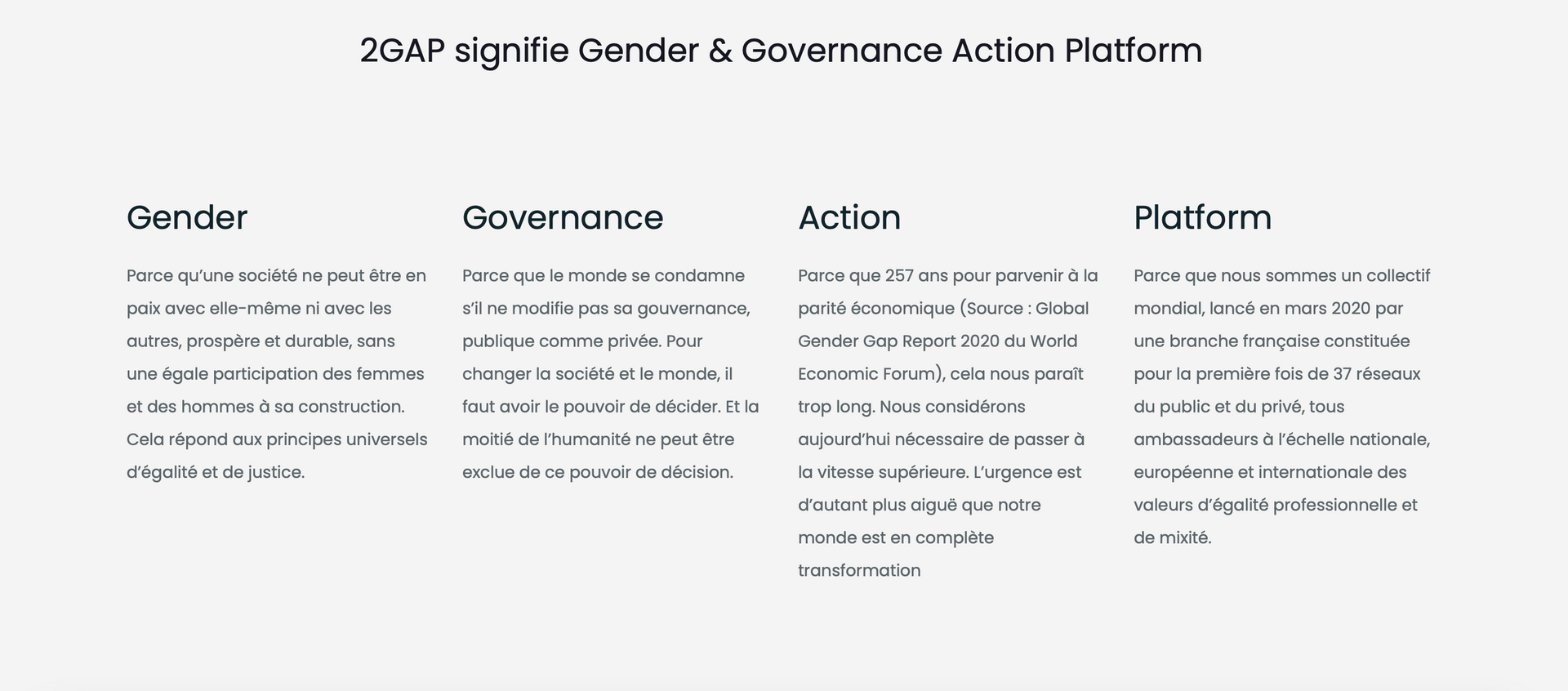 Les réseaux professionnels féminins et mixtes des secteurs public et privé ont décidé de conjuguer leurs énergies et de se constituer en collectif mondial, Gender and Governance Action Platform, pour permettre à nos sociétés d’avancer plus rapidement vers cette égalité réelle que nous n’acceptons pas d’attendre encore plus longtemps.