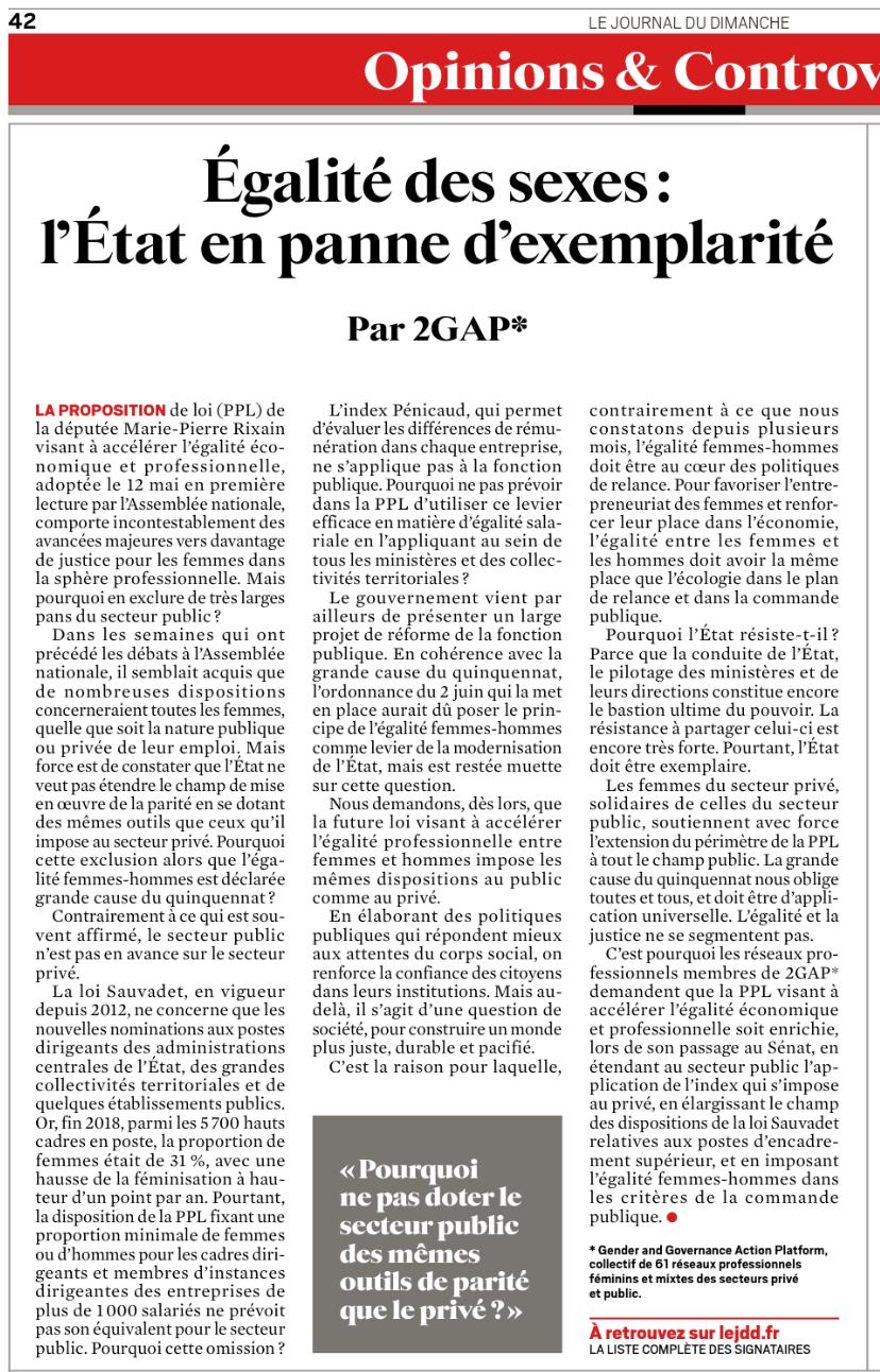 Le collectif 2GAP, composé de 61 réseaux professionnels féminins et mixtes, a rédigé une tribune le 19 juin 2021 dans le Journal du Dimanche. L'appel du collectif suit la proposition de loi visant à accélérer l'égalité économique et professionnelle présentée par la députée Marie-Pierre Rixain et adoptée le 12 mai dernier. S’ils reconnaissent les avancées majeures que permet le texte, les réseaux estiment cependant que ce dernier est insuffisant. En effet, si l'Etat a, ces dernières semaines, manifesté sa volonté de travailler sur le sujet de l’égalité femmes-hommes, il est toutefois réticent à étendre le champ de sa mise en œuvre et à doter le secteur public des mêmes outils qu'il a choisi d’imposer au secteur privé, à l’instar de l’index Pénicaud. Or, les réformes prises ces dernières années pour le secteur public, à l’exemple de la loi Sauvadet en vigueur depuis 2012, ne concernent que les nouvelles nominations sur des postes particuliers du secteur. Fin 2018, parmi les hauts cadres en poste, la proportion de femmes atteignait seulement les 31%. Ces améliorations sont, certes, un moyen de renforcer la confiance des citoyens dans les institutions, mais c’est aussi, et surtout, une question de société.